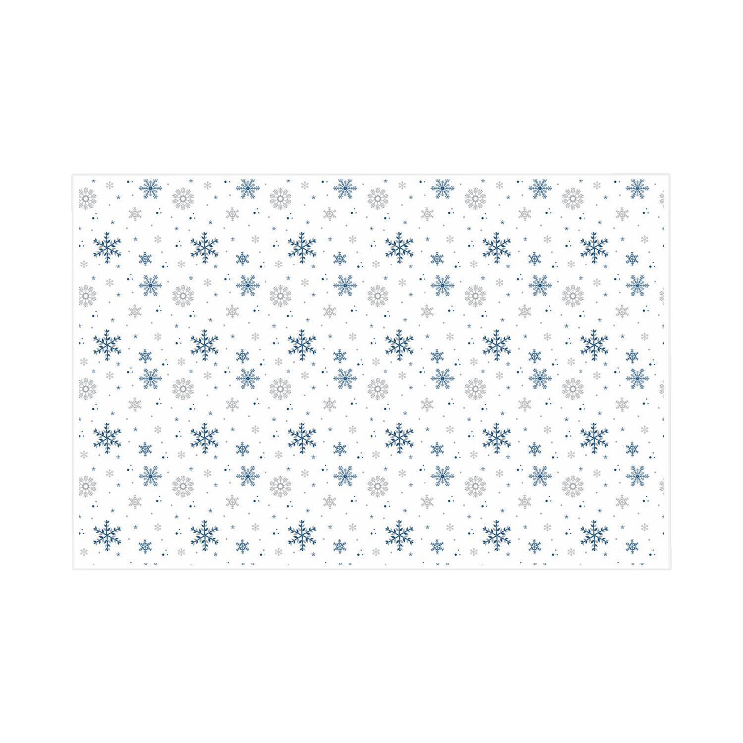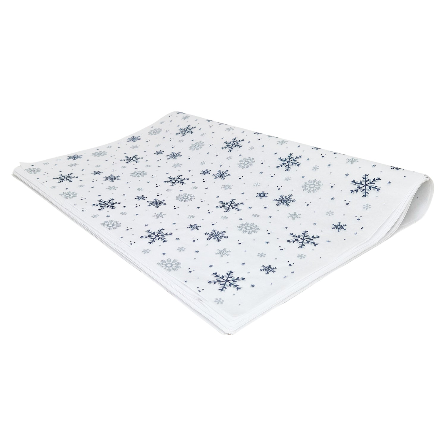 Hârrtie de mătase Frosty Midnight cu fulgi de nea albaștri și gri, cu aspect răcoros și rafinat. O alegere perfectă pentru iarnă.