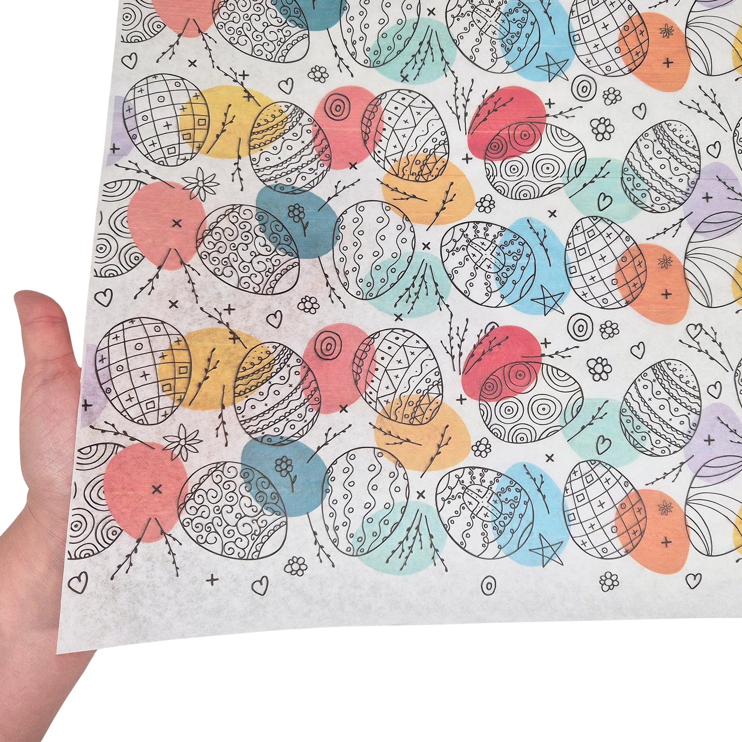 Hârtie de mătase model Paște Color Splash Eggs 28g – format 50x75cm. Ideală pentru cutii cadou, ambalaje pentru Paște sau prezentări premium. Material reciclabil, plăcut la atingere și ușor de modelat.
