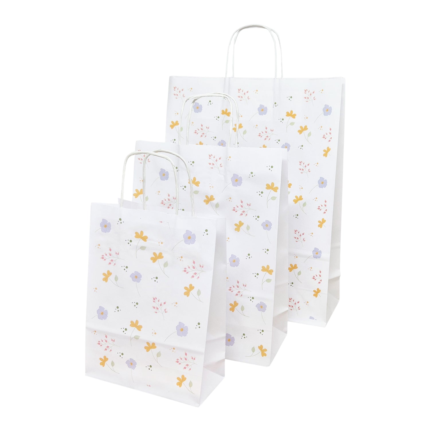 Pungile din hârtie kraft cu modele florale sunt inspirate de natură și primăvară, pentru a aduce un plus de prospețime, culoare și sustenabilitate ambalajelor dvs., oferind o prezentare naturală și vibrantă.