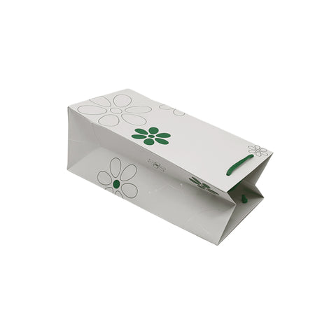 Pungă hârtie ALBĂ (cu model auriu) pentru flori cu mânere din saten 23 x 20(H) x 20cm