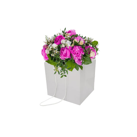 De la 86,00 leiPret pe unitate /IndisponibilPungă hârtie ALBĂ pentru flori cu mânere din șnur textil 16 x 17(H) x 15cm