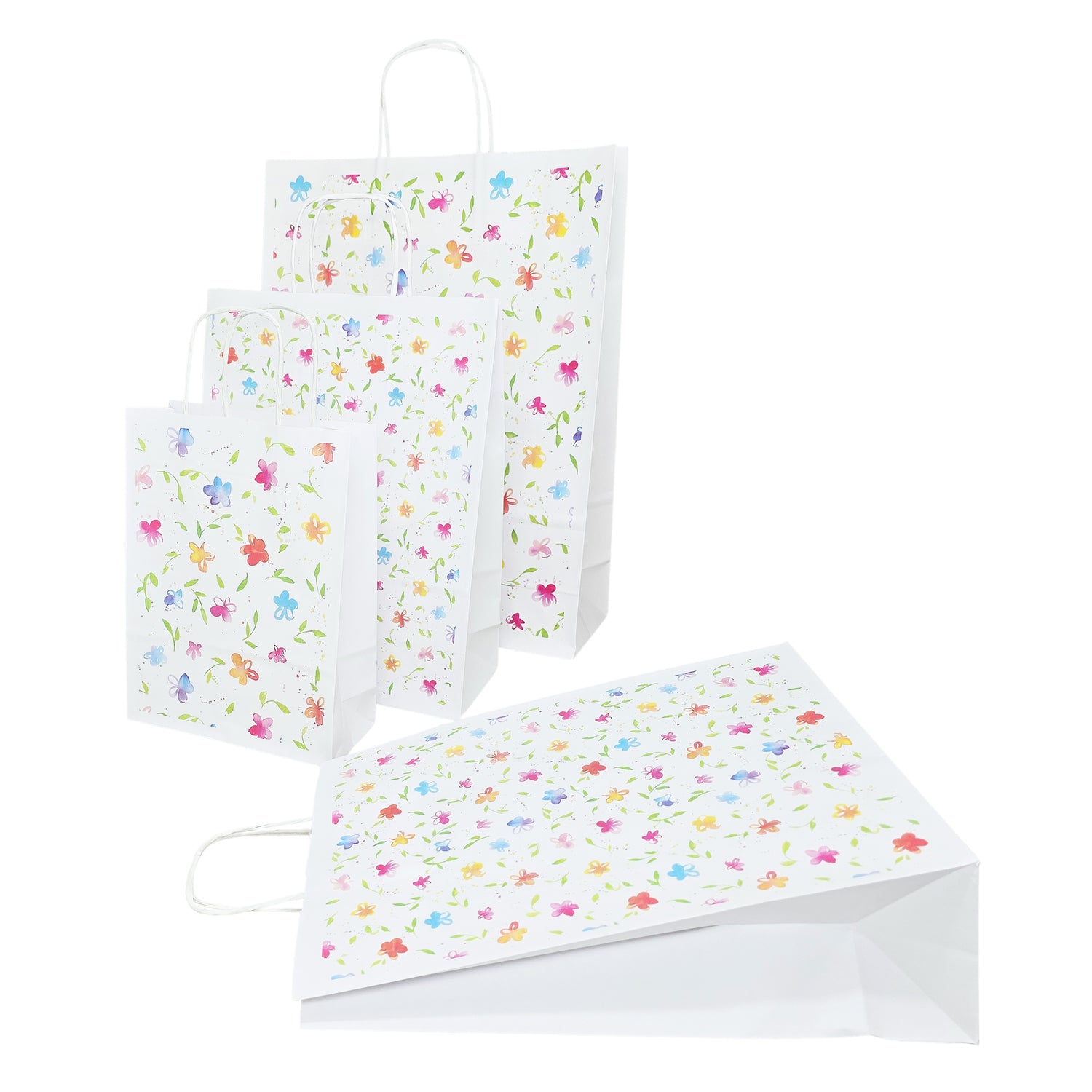 Kraft paper bags with floral patterns are inspired by nature and spring, to bring freshness, color and sustainability to your packaging, offering a natural and vibrant presentation. Made from recyclable kraft paper, these bags are environmentally friendly and are ideal for those who value sustainability. They are made to be resistant and robust, ensuring safe and efficient transportation for a variety of products. Find in our collection floral patterns inspired by nature and spring, with bright and attractive colors, which bring extra joy and optimism. They are ideal for packaging spring gifts, anniversaries, weddings and other special occasions, offering a fresh and cheerful look. They are also perfect for gift shops that want to offer customers a pleasant and nature-inspired shopping experience. You can choose the floral pattern and color that matches the theme of the event or season, to create a harmonious and vibrant visual impact. You can add labels, ribbons or natural accessories to personalize the bags and give them a unique and special touch. Paper color and handles: WHITE with floral pattern Dimensions: 24 x 31(H) x 10cm Paper weight: 100g/sqm – 100% recyclable choose another size 18 x 24(H) + 7cm 24 x 31(H) x 10cm 32 x 41(H) x 12cm SOME EXAMPLES